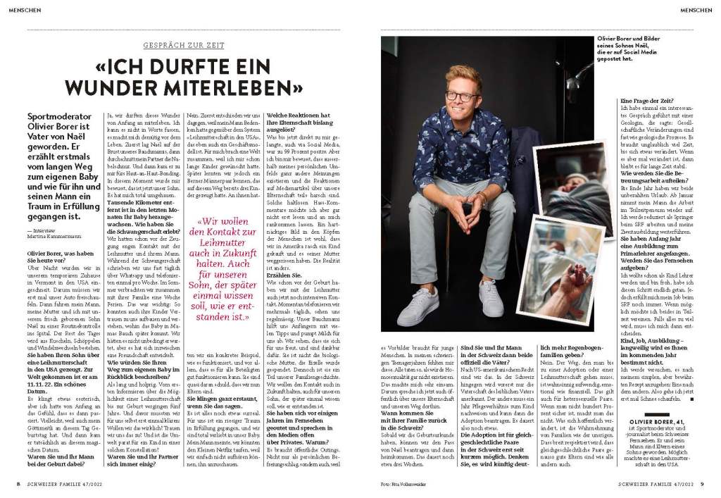 Zwei Männer bekommen ein Kind martinakammermann12. Oktober 202312. Oktober 2023Journalistische Arbeiten Beitrags-Navigation VorherigerWeiter Sportmoderator Olivier Borer ist Vater von Naël geworden. Er erzählt erstmals vom langen Weg zum eigenen Baby und wie für ihn und seinen Mann ein Traum in Erfüllung gegangen ist. Teilen mit: Klicke, um auf X zu teilen (Wird in neuem Fenster geöffnet) X Klick, um auf Facebook zu teilen (Wird in neuem Fenster geöffnet) Facebook Gefällt mir Wird geladen … Ähnliche Beiträge